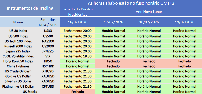 Devido aos próximos feriados, os horários de trading dos produtos relacionados serão ajustados durante o mês de Fevereiro de 2026.