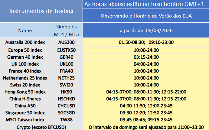 Devido ao próximo início do Horário de Verão nos EUA, os horários de trading dos produtos relacionados serão ajustados em março de 2026.