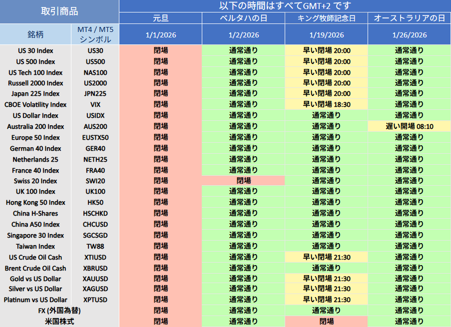 2026年1月の祝日に伴い、関連商品の取引時間が変更となります。