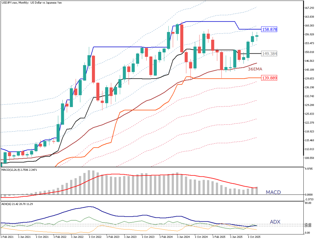 ローソク足は通年を通して36EMA(約3年分の指数移動平均)を上回って推移しており、とくに4〜6月にかけては、このラインが中長期の支持帯として意識されていた。月足で見る限り、円安基調そのものが崩れたと判断する場面には至っておらず、価格は引き続き長期平均の上方にある。