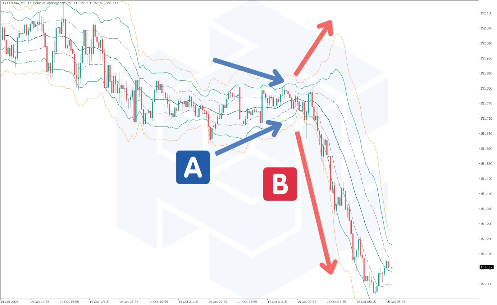 画像のAの部分はボリンジャーバンドの線が縮小しています。これを「スクイーズ期」と呼びます。相場にトレンドが発生する前兆となるケースが多いです。