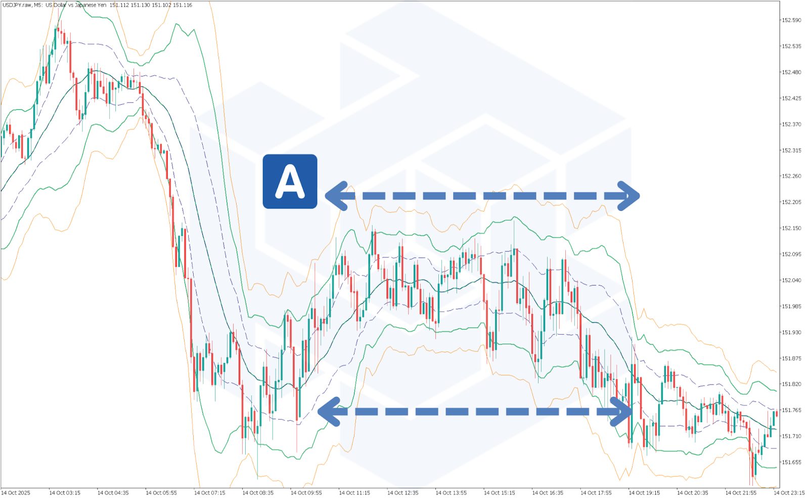 ボリンジャーバンドは、レンジ相場の時、方向感がなくなり、Aのように並行線を形成します。ボリンジャーバンドの線が支持線や抵抗線として機能します。