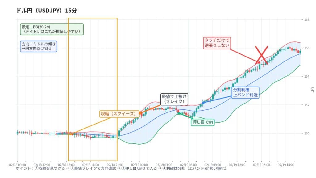 - 利確は分割(反対バンド到達+勢い鈍化など)で固定