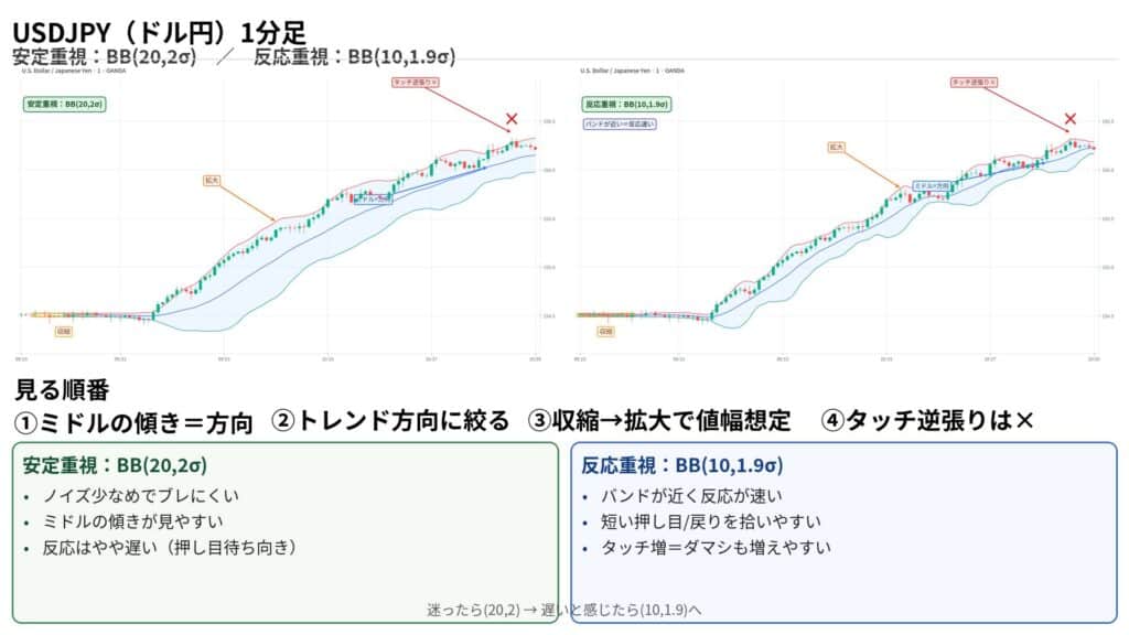 スキャルは反応が命なので、まず(20,2)で癖を掴み、遅いと感じたら(10〜12,1.9〜2.0)へ寄せます。コツは「タッチで逆張り」ではなく、ミドルの傾きで方向を決めて、押し目/戻りで短く抜くこと。急拡大(ボラ急増)の直後は追わず一呼吸。利確・損切りはミドル割れ等の基準を固定すると迷いません。