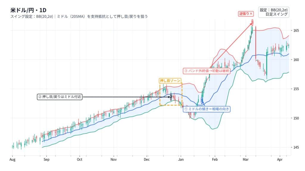 スイングはノイズを減らすのが優先です。まず(20,2)で始め、触れすぎるなら期間を長め(例:50)へ。滑らかになり、押し目/戻りの節目が見やすくなります。トレンド中はミドルが支持抵抗になりやすいので、ミドル付近の反発/反落を待つと入り口が整います。バンド外の終値は初動は継続を疑い、慌てて逆張りは避けましょう。