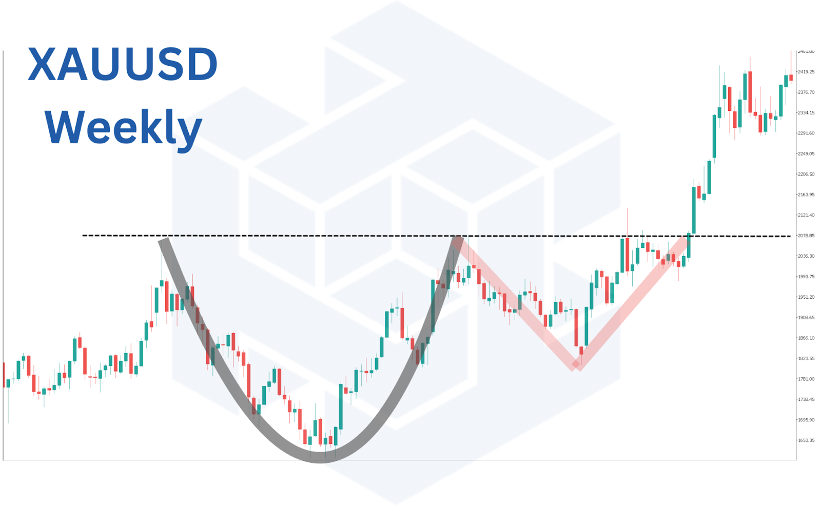 ゴールドの週足チャートでも、緩やかなU字となっていることが確認できますね。