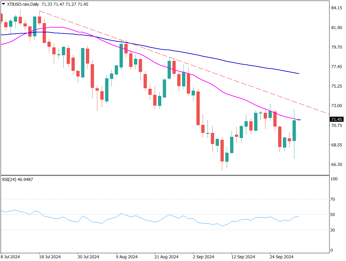 直近高値は73.23ドルであり、直近高値を上抜けすると、トレンドラインの突破を試す動きが出る可能性もある。中東情勢が落ち着けば、反落するリスクもある。RSIは46で推移しており、50を上抜けするかどうかに注目。