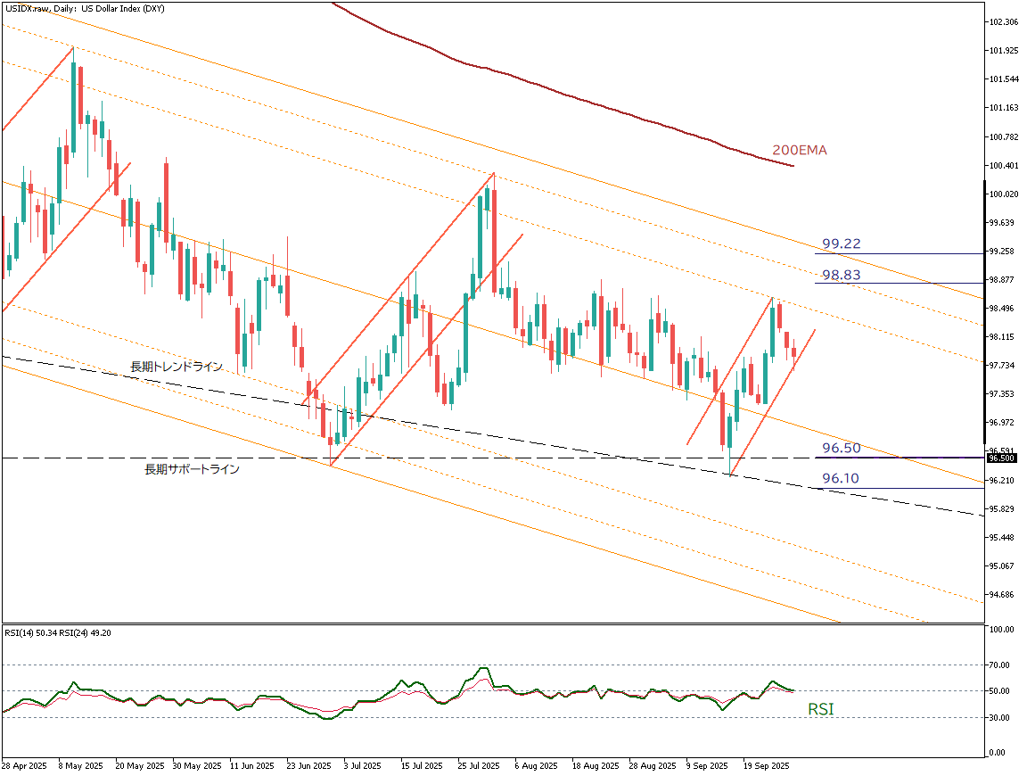 米ドル指数は利下げ観測で軟調推移。足元では複数の長期サポート帯で短期反発も視野に入るが、これを割り込むと下落再燃も懸念される。