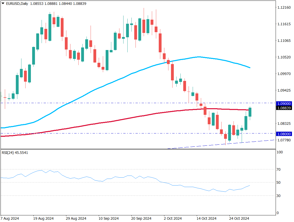 ユーロドルの技術分析では、4日連続の上昇後、1.09ドルが次の重要な抵抗線となっている。