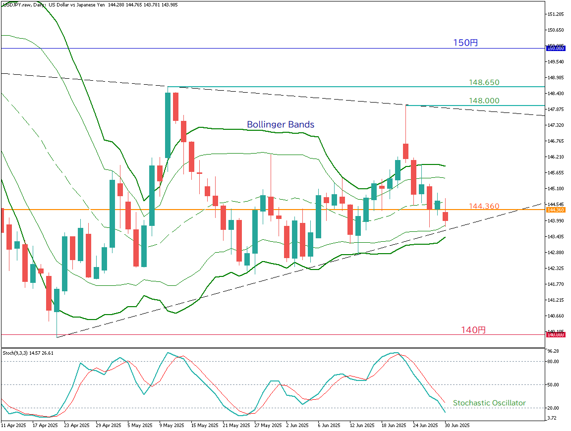 米ドル/円(USD/JPY)の日足チャートを分析する。現在の価格推移は144.36円を中立軸とする上昇型のレンジで推移しており、ボリンジャーバンドの±1σ〜±1.5σ内での反発が継続している。