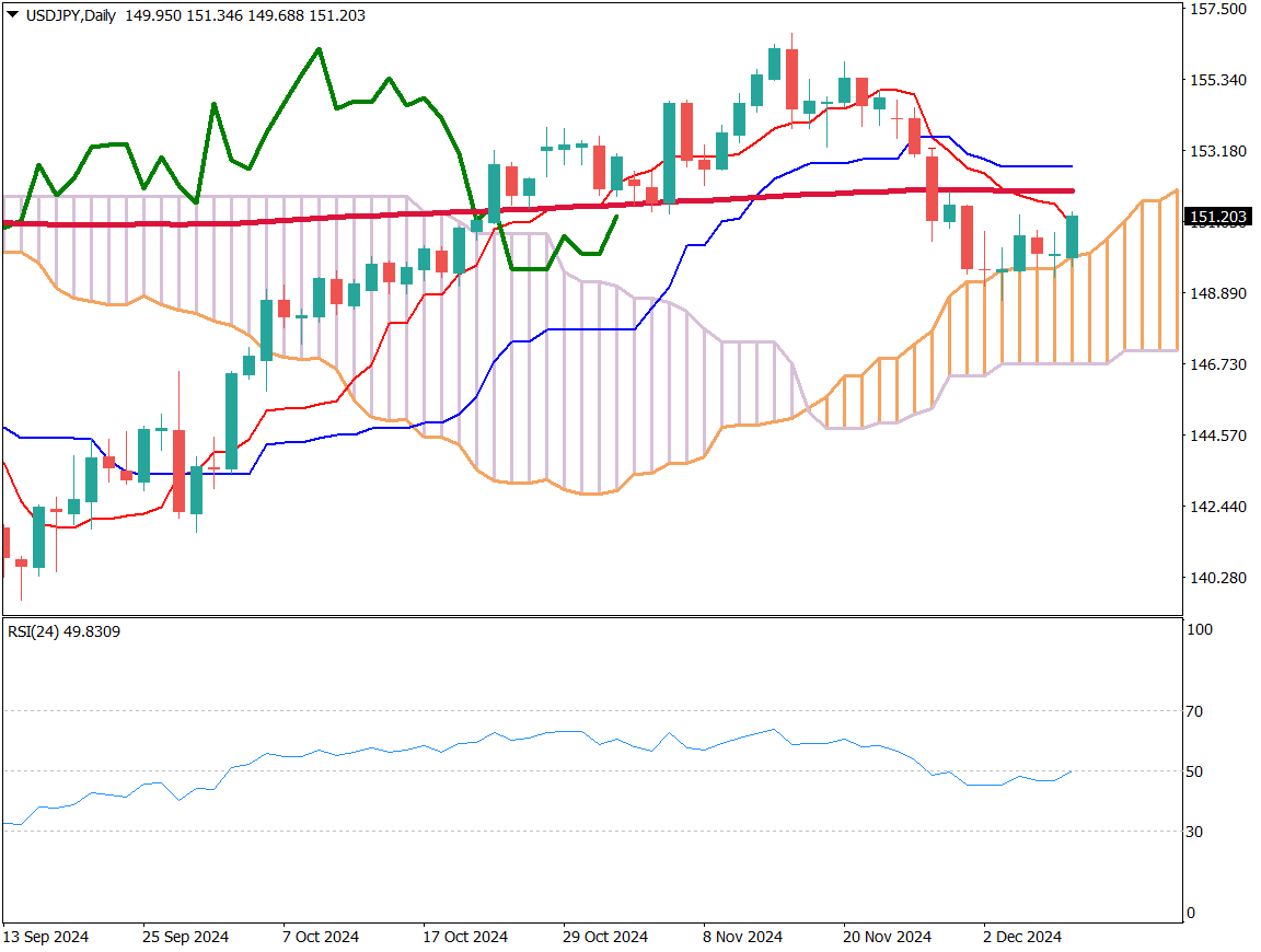 テクニカル面では、ドル円は一目均衡表の雲上限で反発し転換線を上回ったが、200日移動平均線が上値の重しとなっている。市場関係者の8割が1月までの利上げを予想しており、RSIは49.8まで回復したものの、50付近では戻り売りが強まる傾向がある。