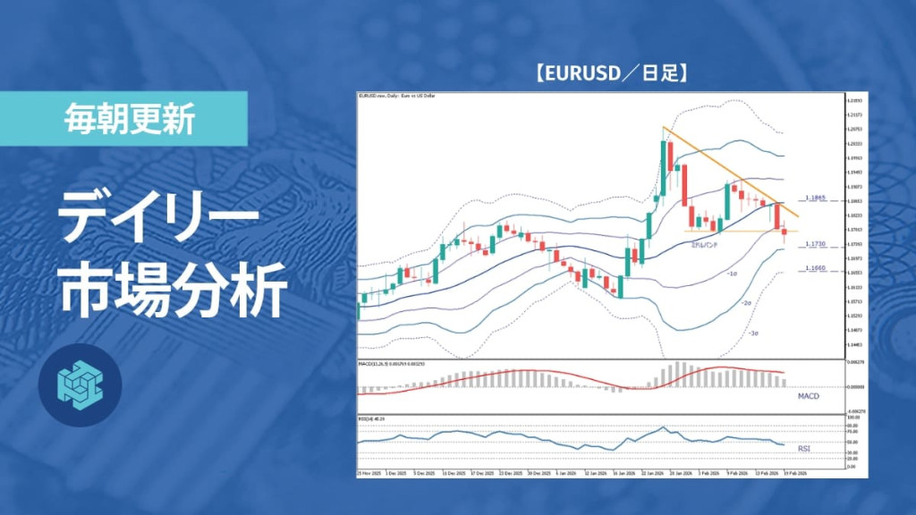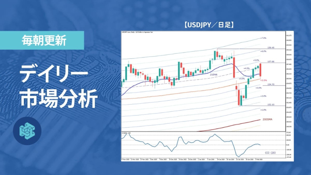直近のローソク足は長い陰線となり、157.66円付近から押し戻される形で下落した。ただし、エンベロープの+3.5%ライン付近で下げ止まって引けている。今回の調整はこれまで上昇を牽引してきた+4.5%以上の「推進帯」から、過去にも反発の起点となった+3.5%水準への押し戻しであることがわかる。