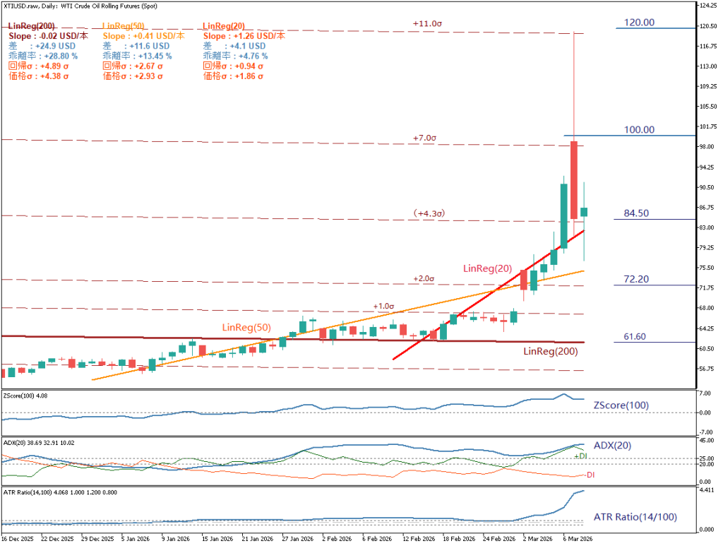 WTI原油の日足は、急騰・調整・再上昇という三段階の値動きを経て、現在85~86付近で推移している。長期トレンドの基準線である200日回帰直線(LinReg200)を上回っており、大局的な上昇構造は維持されている。