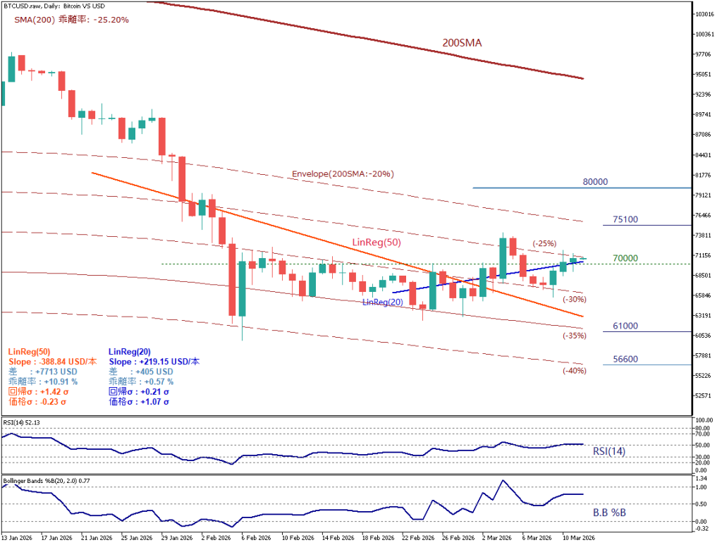 当面の焦点は7万ドルだが、上抜けて定着すればエンベロープ-20%水準(7万5100ドル付近)、さらに心理的節目となる8万ドルが視野に入る。一方、-35%水準(6万1000ドル付近)を割り込めば-40%水準(5万6600ドル付近)への下落余地が広がる。