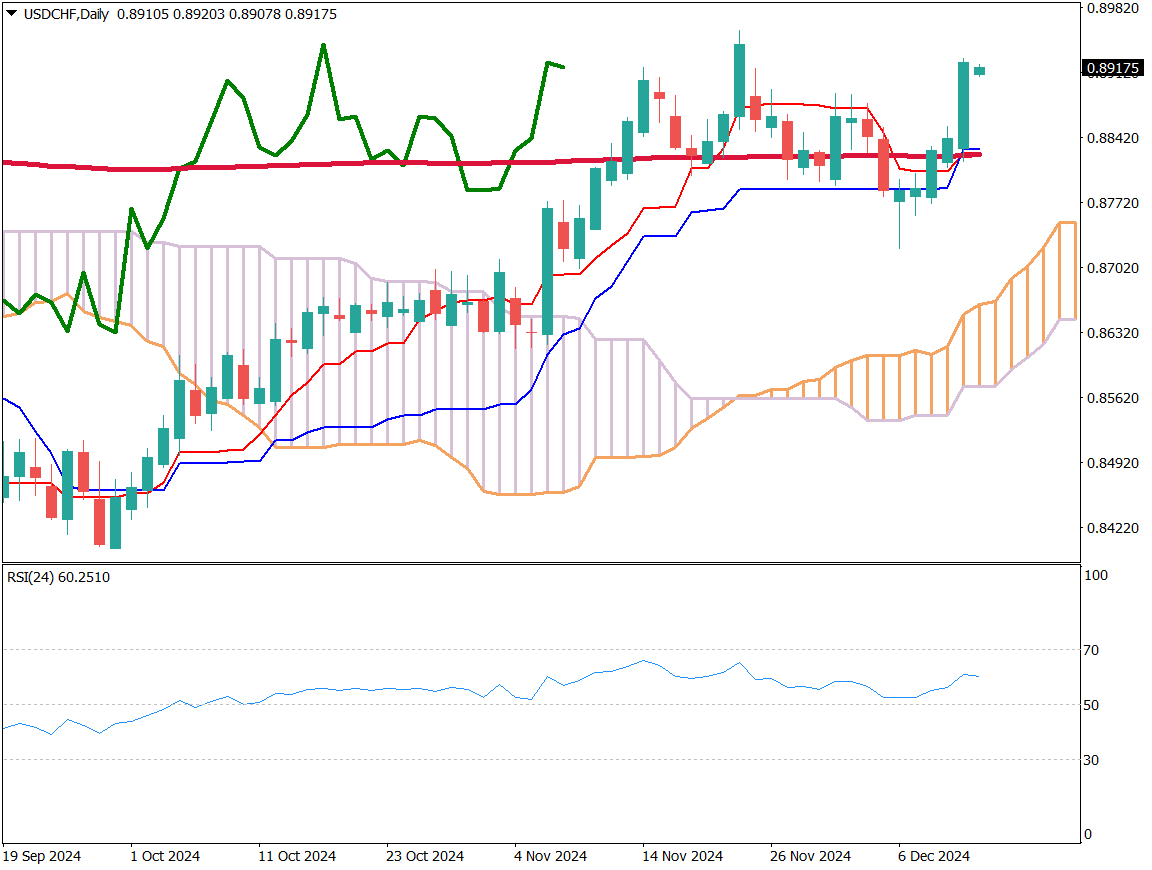 米ドルスイスフランの日足チャートを分析する。レンジ相場を形成していたが、スイス中銀の大幅利下げによって大きく上昇した。5日続伸し、200日移動平均線の上側で推移しており、直近高値である0.8950ドルを上抜けするかが注目される。