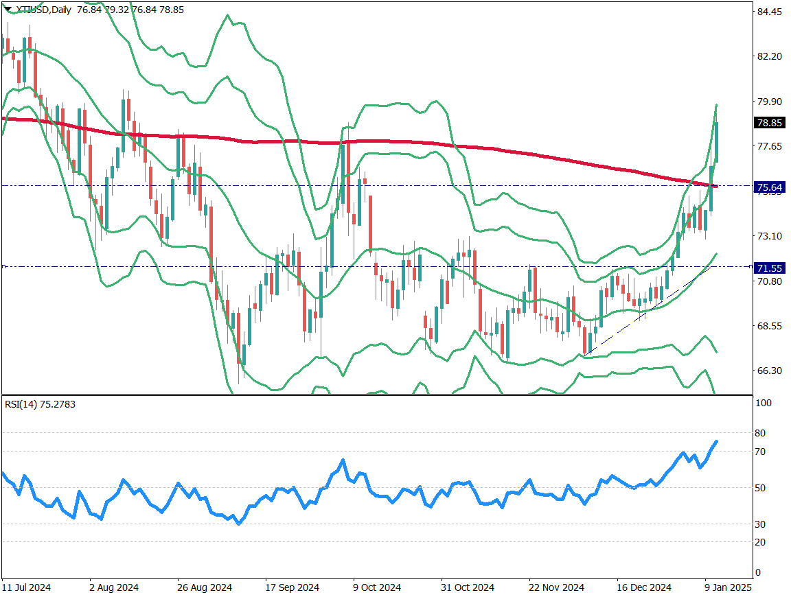 原油の日足チャートを分析する。原油は2日連続で大幅高となっている。わずか2営業日で74ドル台から79ドル付近まで急騰。背景には米国によるロシア産石油への新制裁がある。現在、200日移動平均線を上回っており、ボリンジャーバンドの+3σ線に接近中。