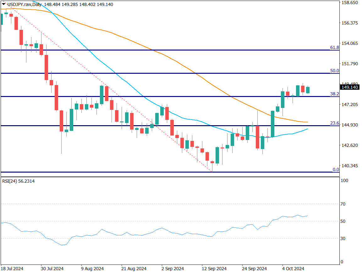 米消費者物価指数が予想を上回り、大幅利下げ観測が後退。ドル円はフィボナッチリトレースメントの38.2%で反発し、50%に当たる150.70円を目指す可能性がある。RSIは56で上昇基調を維持。