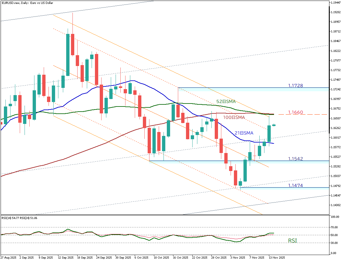 足元ではローソク足が21日SMAを上抜け、52日SMAおよび100日SMAが重なる水準(1.1660ドル付近)に接近する場面を迎えている。