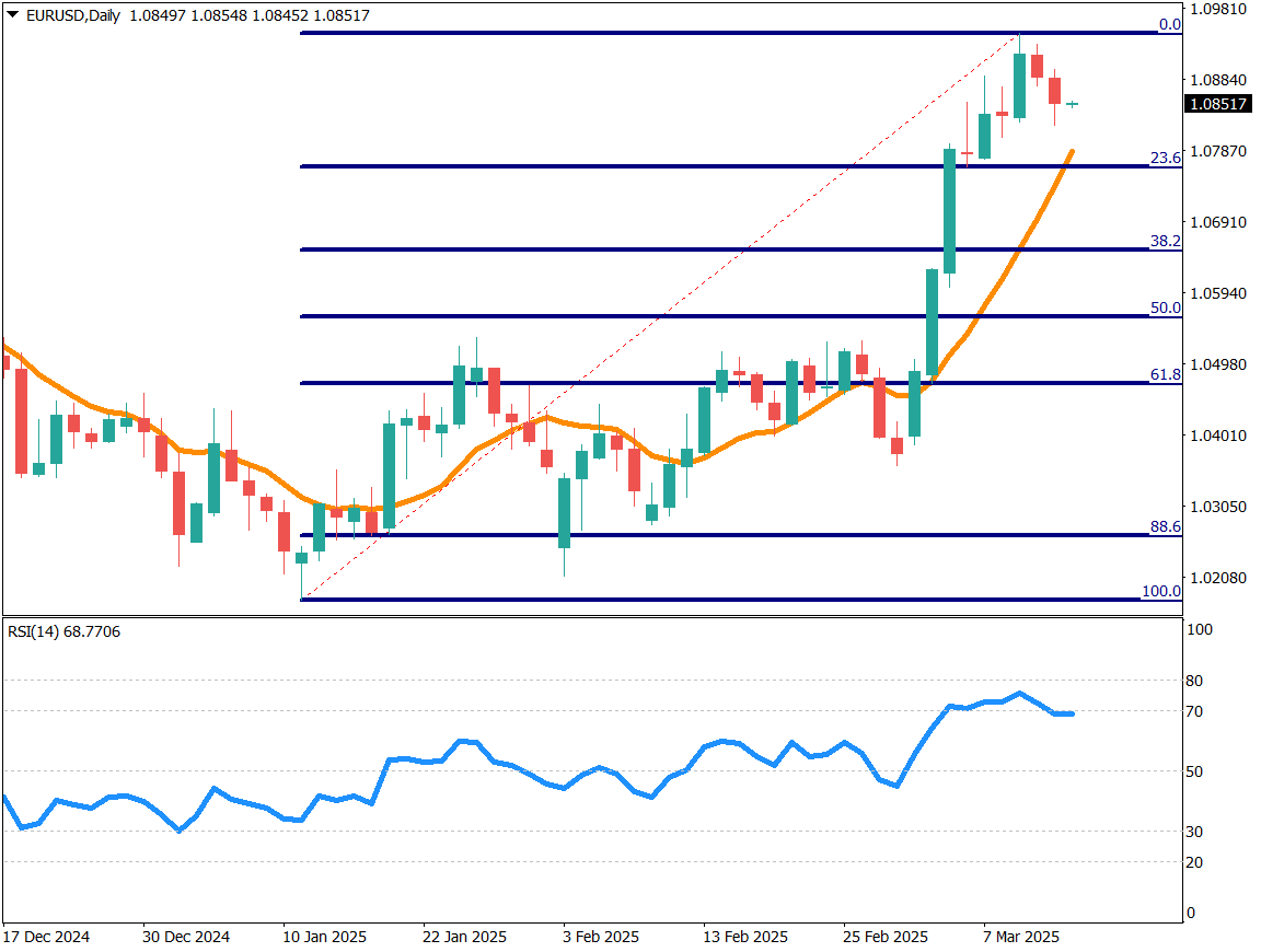 ゴールドは関税発表を受けたリスクオフで2988ドルの最高値を更新。植田日銀総裁は賃金上昇継続をコメントし金利正常化期待。ドル円は10日移動平均線で反落し円高継続。ユーロドルはRSIが68に下落し、1.078ドルまでの調整の可能性あり。