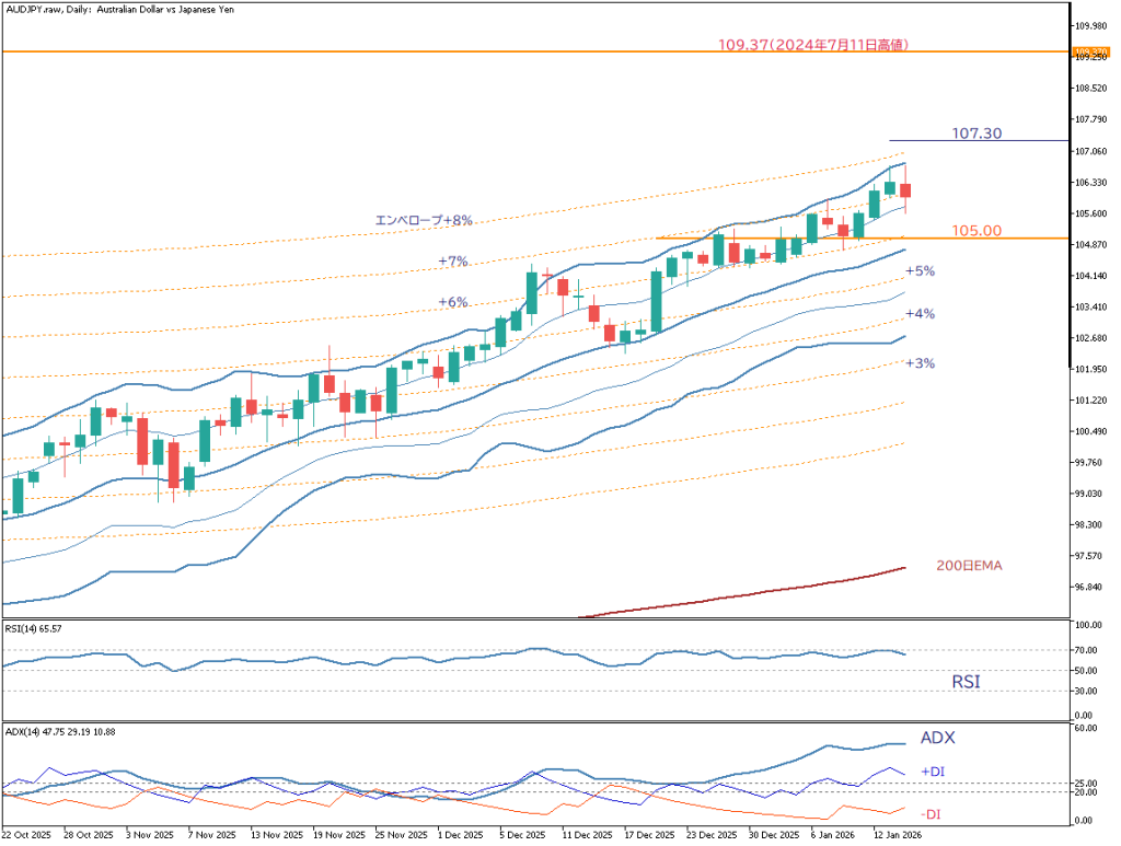 したがって再びエンベロープ+8%に当たる107.30円付近まで拡大できるかが上昇トレンドの強さを確認する判断材料となる。一方、105円を明確に下回る場合は過熱修正としてトレンド評価を引き下げる必要が生じる。