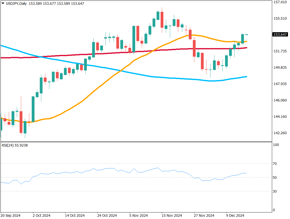 ドル円の日足チャートを分析する。ドル円は7日続伸しており、円安ドル高基調が継続している。先週は陰線が1回もなく、陽線だけとなった。終値は26日移動平均線を上回り、153.65円付近で推移している。最高値は161円台だが、再度トライする可能性がある。