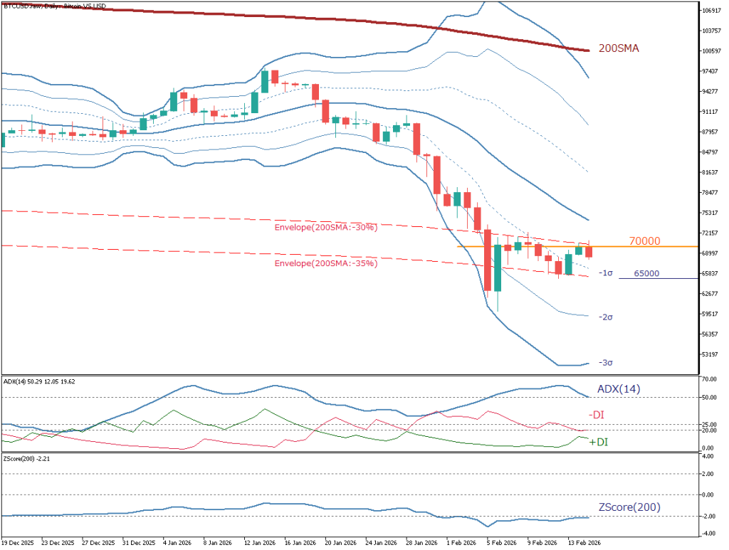 注目はエンベロープ-30%ラインである。ここを日足終値で上抜けて維持できるなら、同時に7万ドルも越える形になり、市場の見方は反発が「戻り」から「巻き戻し」へ移る可能性が高まる。逆に-35%(6万5000ドル付近)を日足終値で下抜ける場合は、レンジ下限が維持されなかったことになり、再び下方向優位となるリスクが高まる。
