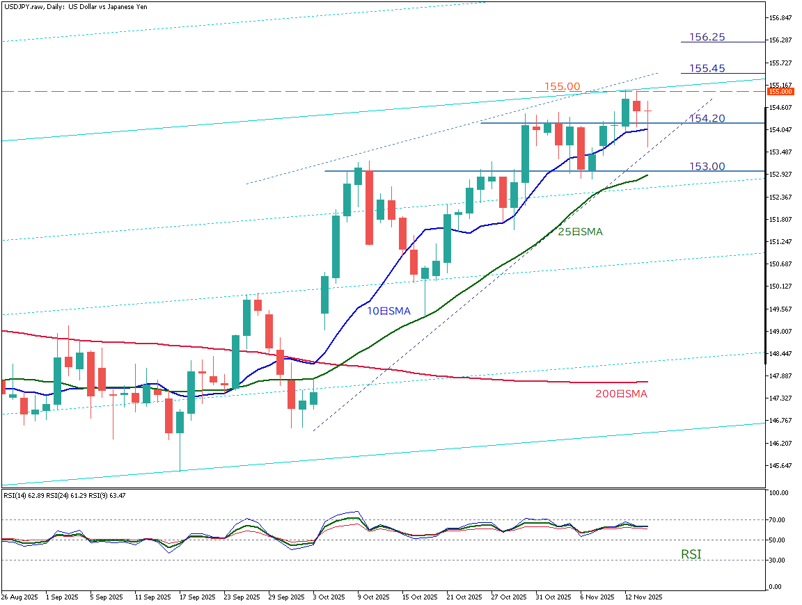 当面の注目点は、155円の攻防と10日移動平均線によるサポートが継続するかどうかである。