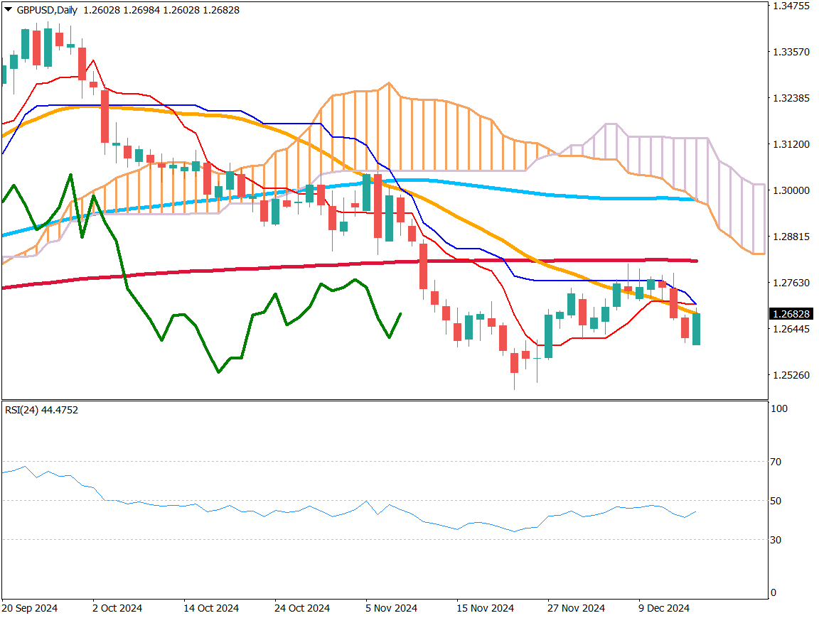 ポンドドルの日足チャートを分析する。ポンドドルは安値圏で包み足を形成し、反転の兆しがある。しかし、26日移動平均線が上値を抑えており、基準線や転換線も上値に控えている。本日の英雇用統計や今週の英中銀の政策金利が大きく影響しそうだ。