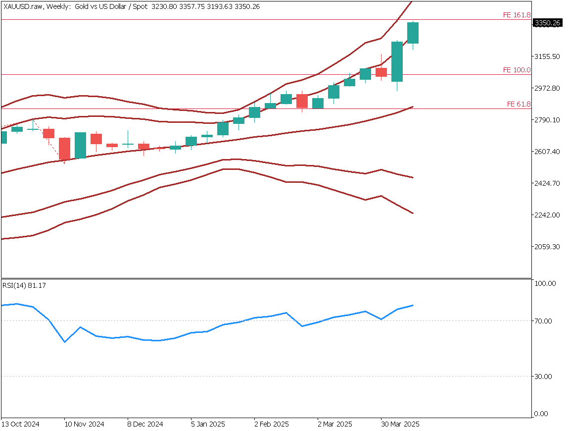 金価格は週足で見ると3.69%上昇し、ボリンジャーバンド+2σ線を上回る強い上昇トレンドを維持している。RSIは81と過熱感を示し、3350ドル付近で推移。フィボナッチエクスパンション161.8%の3360ドルに接近中で、2019年RSI最高値の84に近づいており調整リスクに注意が必要だ。