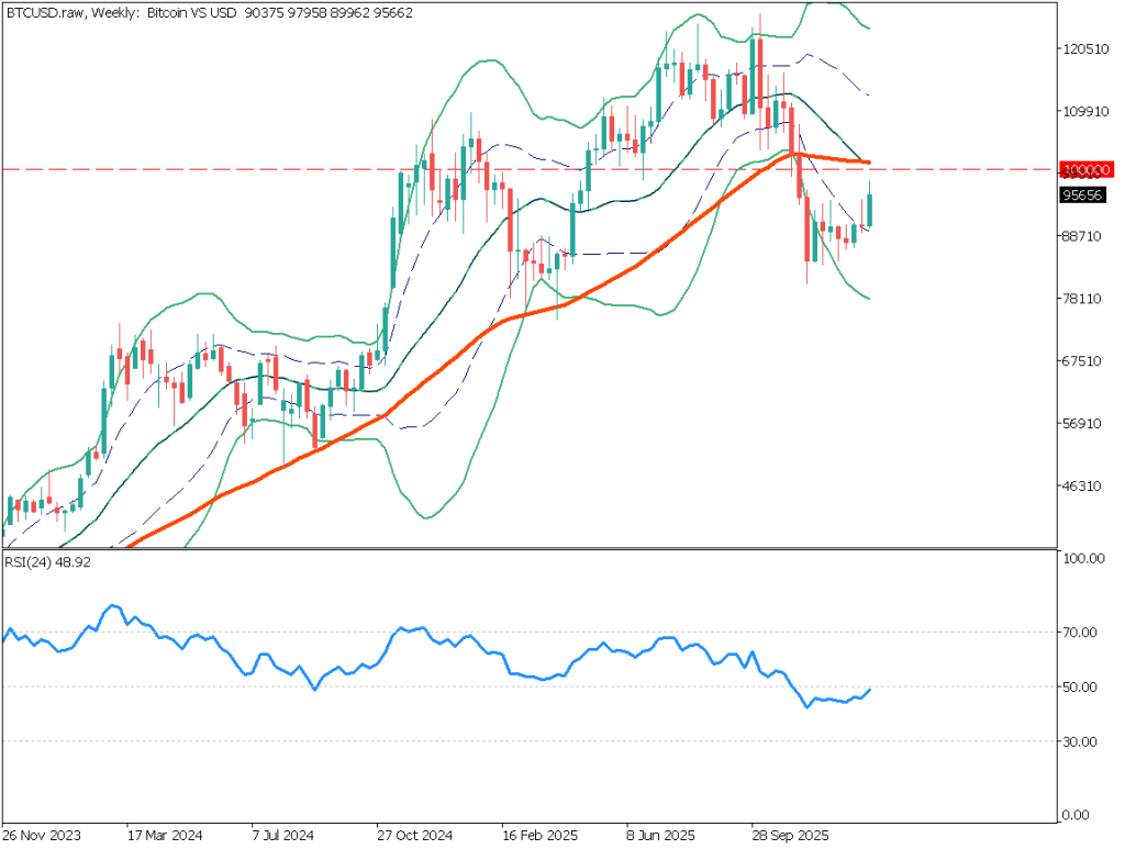 ビットコインは上昇しているものの勢いは弱く、週足で52週移動平均線を下回り、戻り高値形成の可能性が意識されている。RSIは50を下抜け後に反発しているが、抵抗線として機能しやすく、戻り売りに警戒が必要だ。
