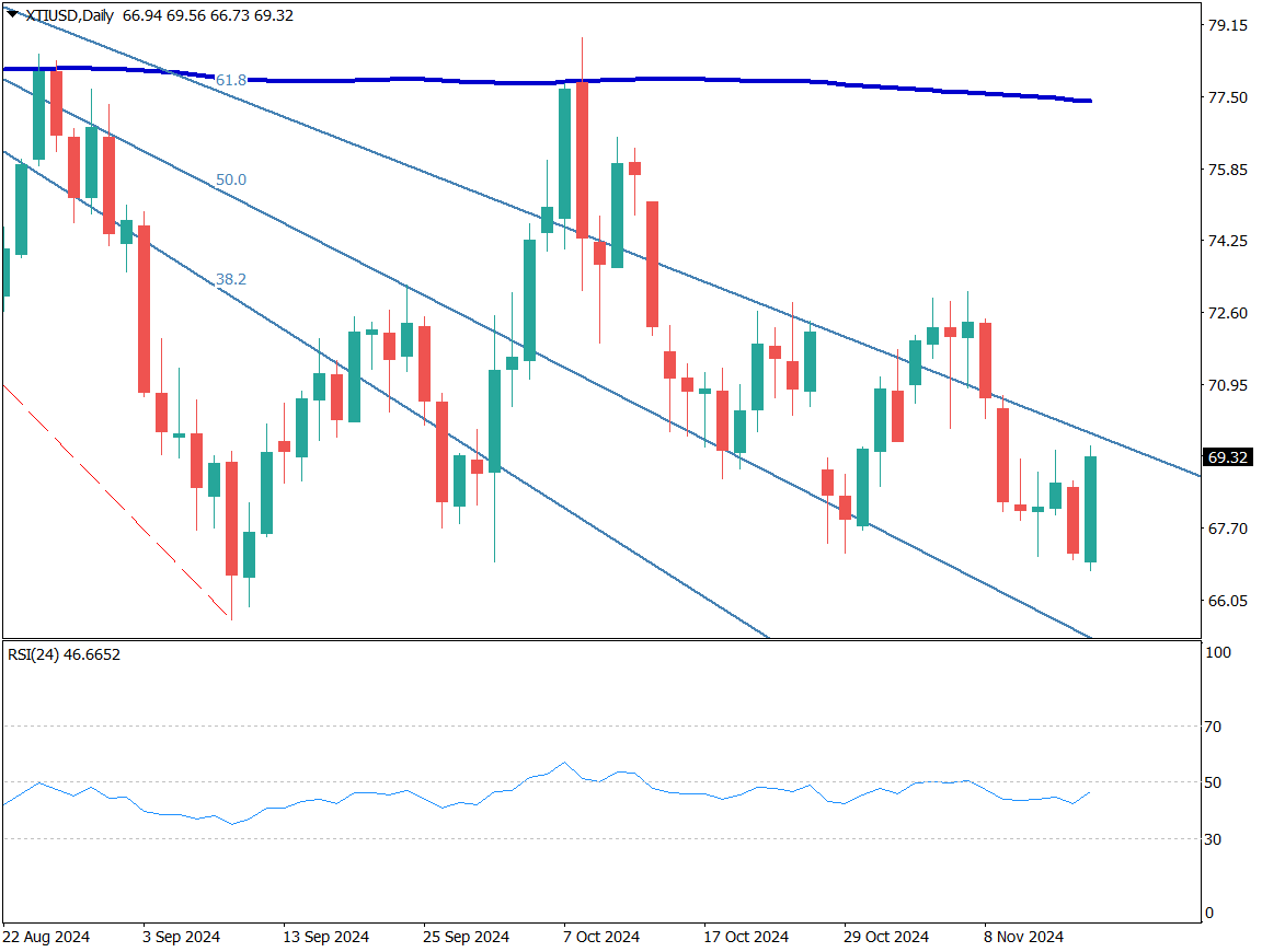 19日の市場では原油が大幅反発し、バイデン政権がウクライナのロシア領内攻撃を許可するとの報道が影響した。原油は67ドル付近で反発し、69ドル近辺で推移している。