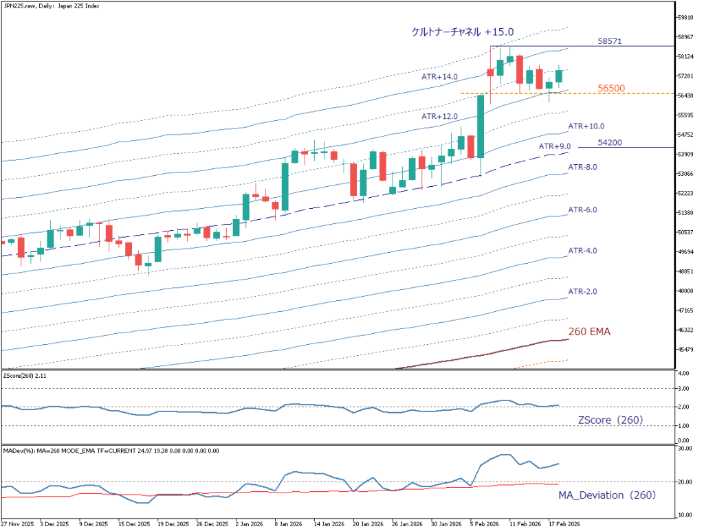 日経225の日足チャートを分析する。ローソク足は58,571pt到達後は56,500pt上で推移し、高値圏でのもみ合いが続いている。58,571ptはケルトナーチャネル+15.0%水準であり、過去10年でわずか3回しか到達していない過熱域だ。