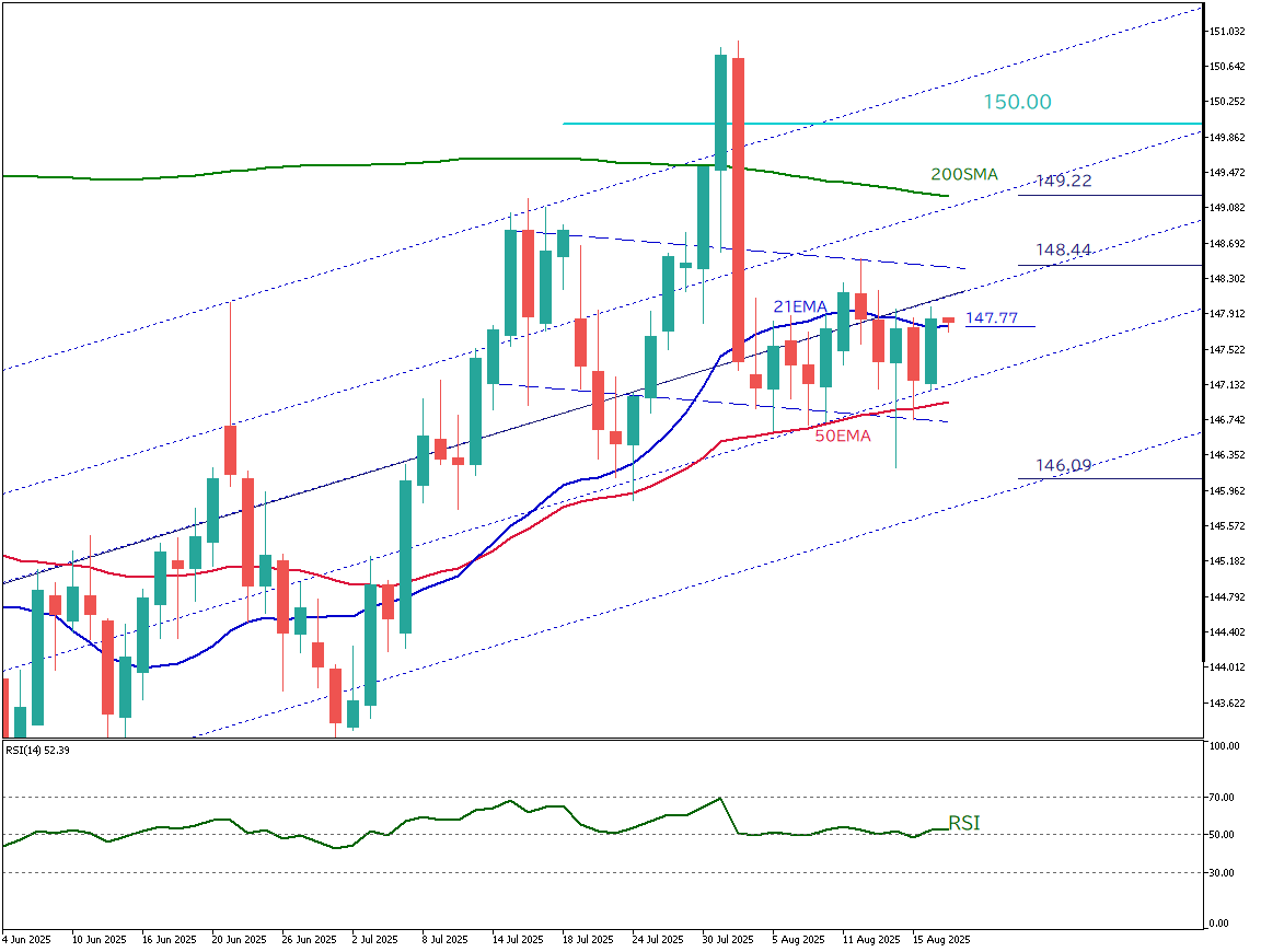 現局面では、現在147.77円近辺の21EMAを明確に上抜けできるかが、上昇基調への回帰を判断する重要な分岐点となる。