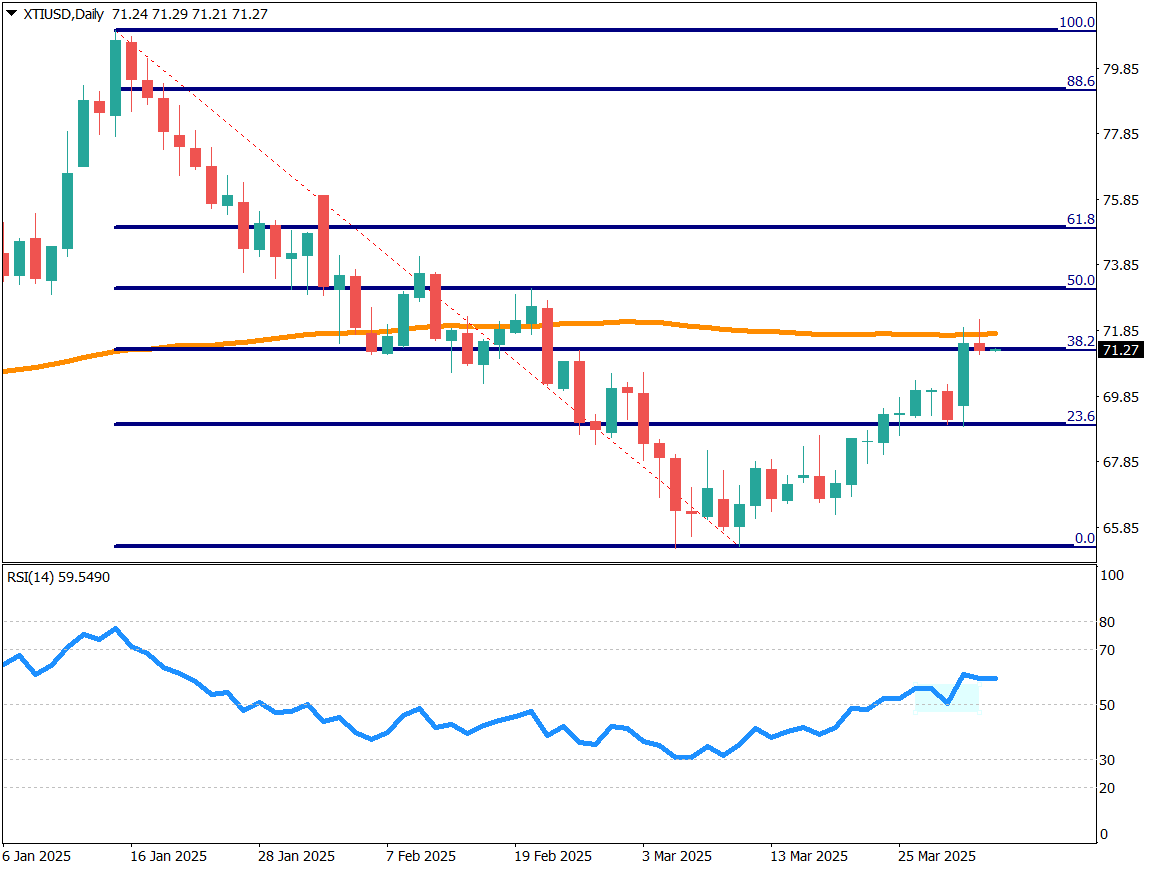 意識されている72日移動平均線を上回れば、半値に該当する73ドル付近を目指して上昇を継続する可能性がある。関税発表やロシアとの交渉のニュースが入るたびに大きなボラティリティとなる。本日、明日未明の動きには十分注意したい。