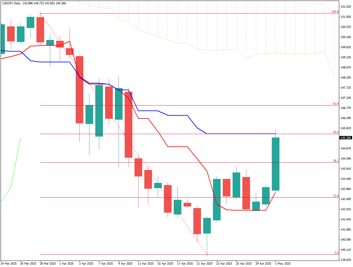 さらに、3月28日の高値と4月22日の安値を結んだフィボナッチ・リトレースメントでは、50%戻しの水準がちょうど一目均衡表の基準線と重なっており、145.5円近辺が強いレジスタンス帯として機能する可能性が高い。加えて、週足チャートでも基準線が同水準に位置しており、複数の時間軸で同一点に抵抗が集中している点は注目に値する。
