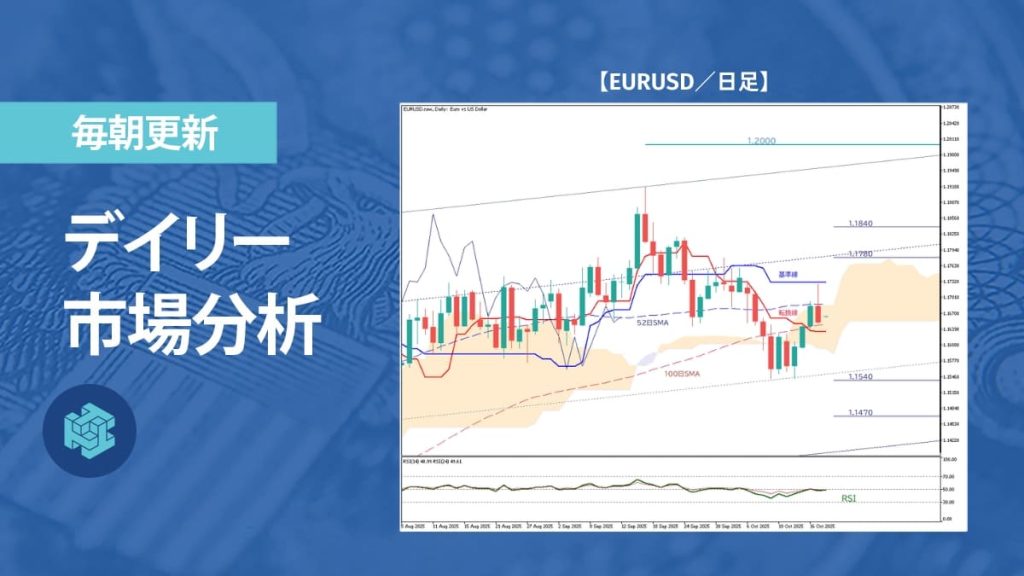 ユーロドルは堅調な米経済を背景としたドル買い優勢の流れに上値を抑えられ、戻りは限定的。テクニカル面では、一目均衡表の雲上限を試す展開が続いており、上抜け定着の成否が中期的な上昇転換の可否を左右する局面となっている。