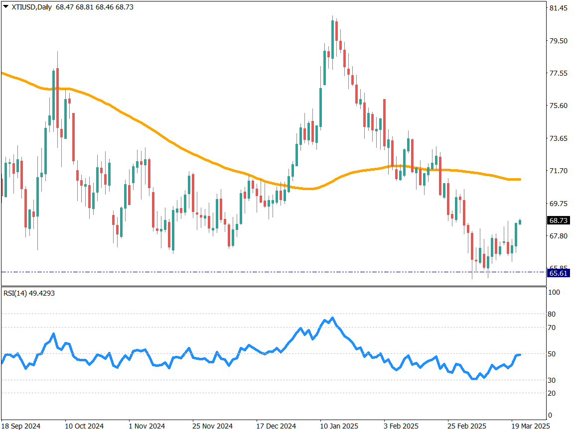 原油の日足チャートを分析する。原油は65.6ドルで反発後、再び上昇の勢いが強まっている。RSIが49に到達しており、50を上回るかどうかに注目。50は一般的に戻り売りが強まる数値とされる。