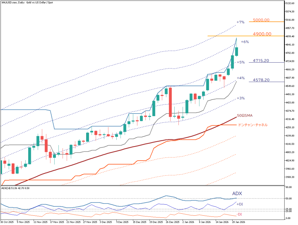 ゴールドの日足チャートを分析する。チャートは明確な上昇基調にあり、史上最高値圏での高値更新が続いている中、次は節目の4900ドルを試す展開である。