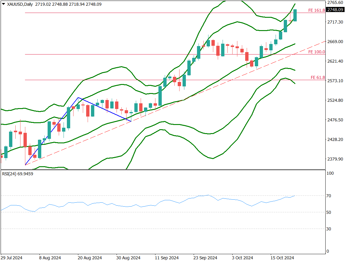 ゴールドは2750ドル近辺まで上昇し、強い上昇基調を維持している。3日連続でボリンジャーバンド+2σ線を上回り、フィボナッチエクスパンション161.8%を突破した。