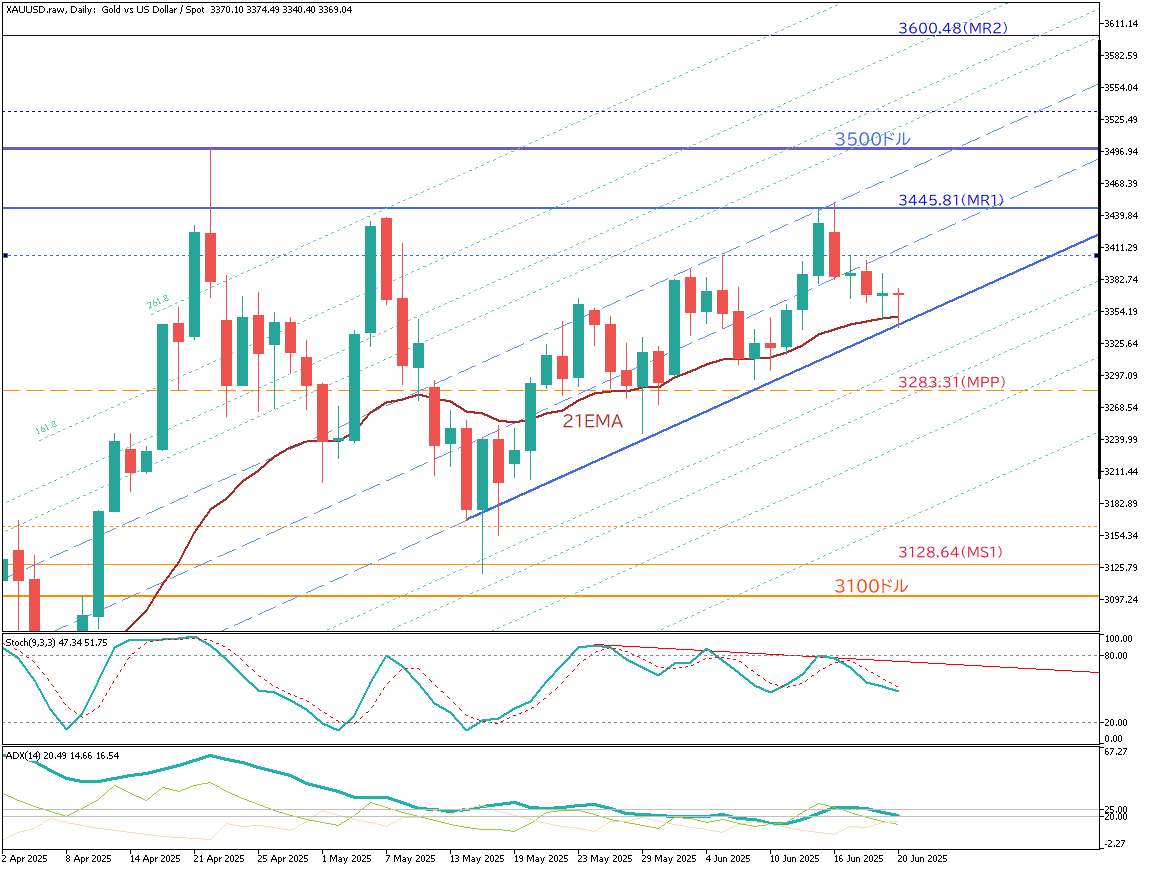 ゴールド/米ドル(XAU/USD)の日足チャートを分析する。ゴールドは依然として上昇トレンドを維持しており、直近では21EMAに下支えされながらローソク足の下値を徐々に切り上げている。ただし、3445.81ドル付近では複数回にわたり上値を抑えられており、高値更新には至っていない。