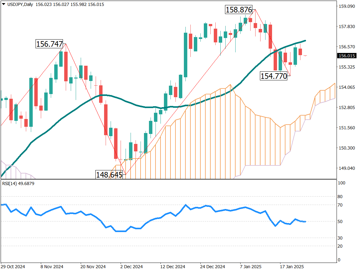 一方でトランプ大統領は金利引き下げを要求。ドル円は26日移動平均線を割り込み、156円付近で推移。RSIは49で下落基調を示唆している。今後は154.77円の節目が注目される。