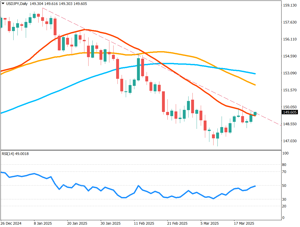 ドル円相場は26日移動平均線を上抜け、下落トレンドラインに接近している。トランプ政権の関税政策が4月2日に発表予定だが、見通しは不安定な状況が続いている。一方で関税は限定的との見方も出始め、米株式市場は終盤に急回復した。