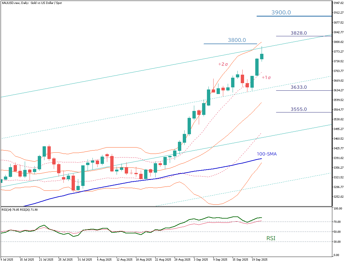 足元では、長期上昇チャネルの上限と重なる水準で推移しており、節目となる3800ドルを試す構図が続いている。