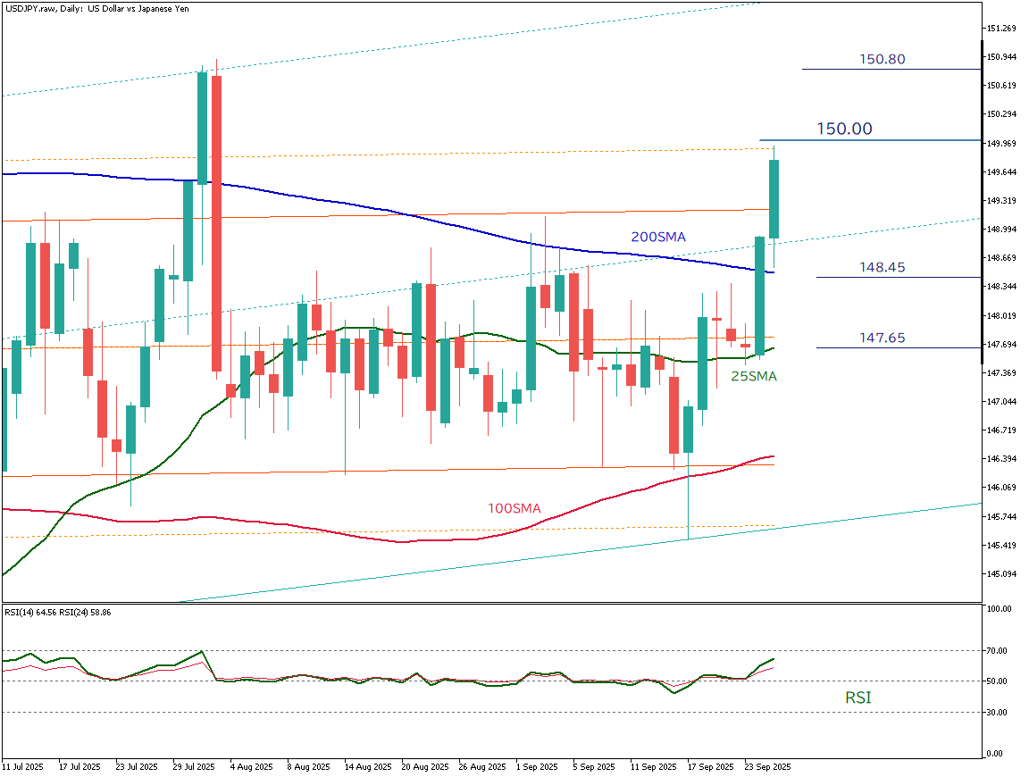 ドル円の日足チャートを分析する。直近では200SMAを上抜け、足元では心理的節目である150.00円に迫る展開となっている。これまで抑えられていた主要な抵抗線を明確に突破しており、上昇圧力が一段と強まった構図である。