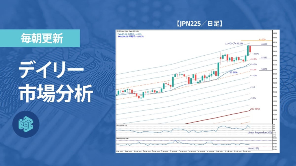 押し目レベルは、エンベロープ+22.5%水準(57250pt近辺)が一次サポート候補となる。浅い押しならここで踏みとどまりやすい。より深い調整が入った場合は+17.5%水準(54870pt近辺)が防衛ラインとなる。