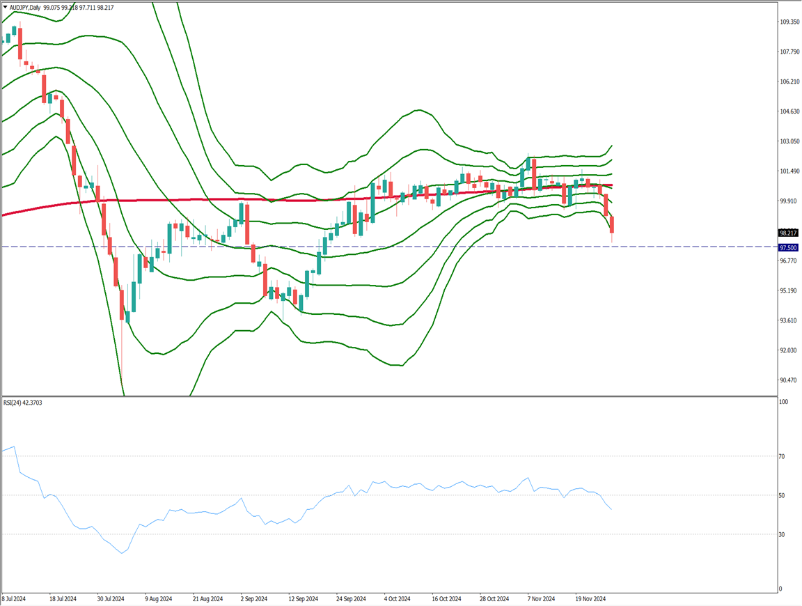 豪ドル円も98円台前半まで下落し、ボリンジャーバンドがエクスパンション期に入っており、新たなトレンドの発生が示唆される。