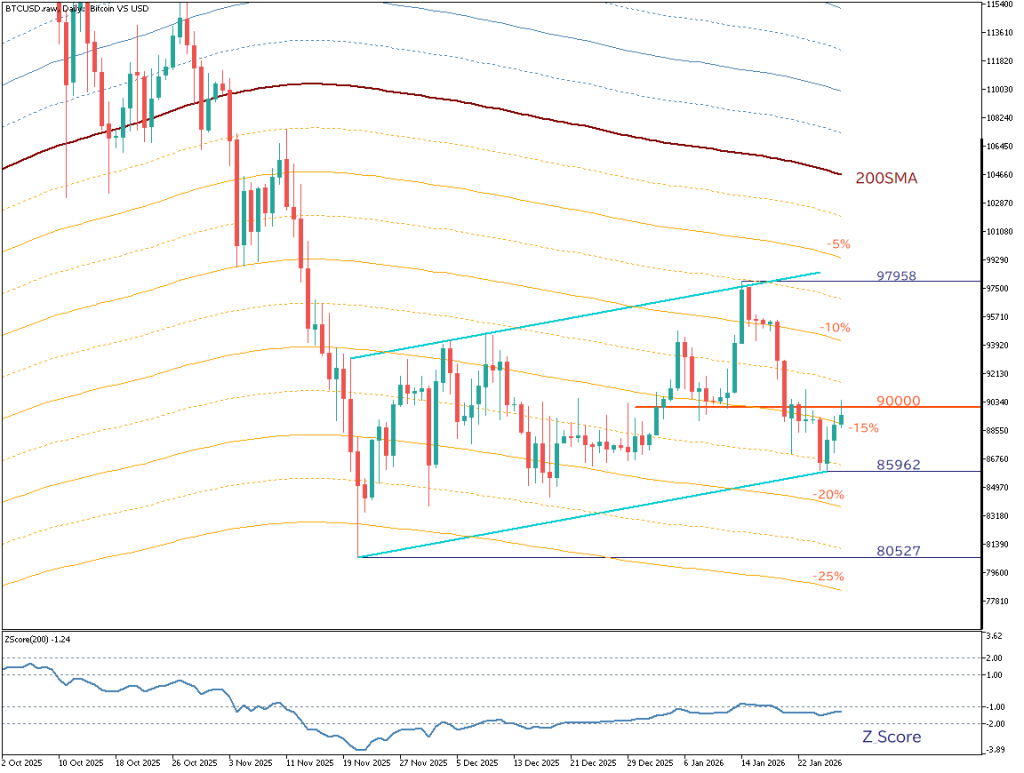 今後は、エンベロープ−15%水準の維持が優先の確認点となる。価格面では9万ドルを上抜けるかが分岐点であり、これを超えれば直近高値の9万7958ドルが次の上値目標だ。逆に8万5962ドルを割り込むなら、8万527ドル付近までの調整もあり得る。現段階では回帰の質を見極めていきたい。