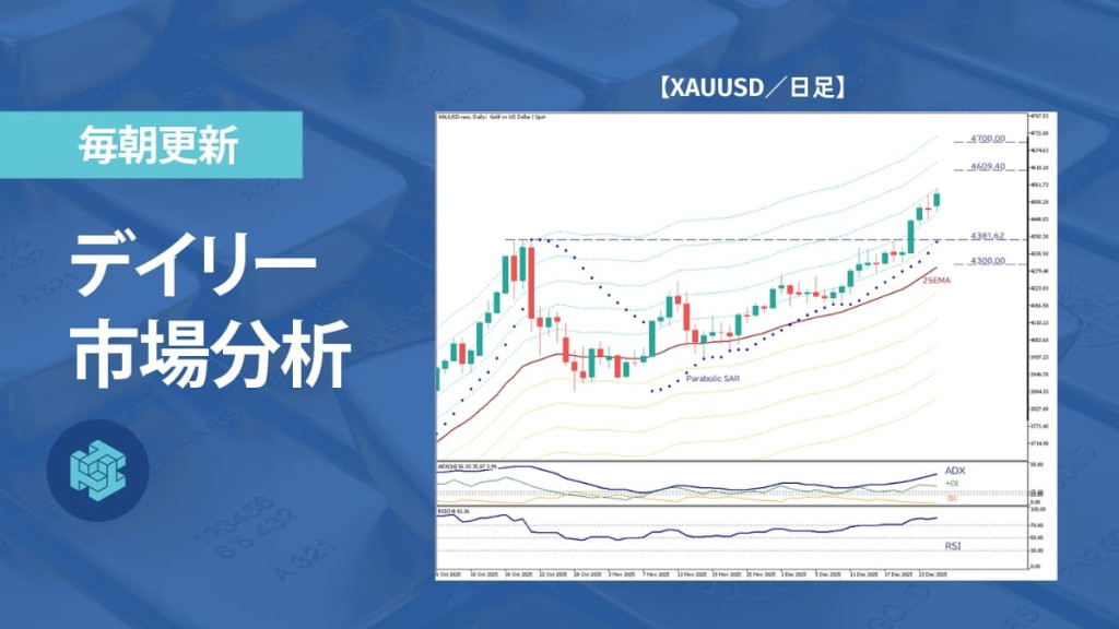 このまま上昇が続けば4609.40ドル、さらに4700.00ドルが上値の目安となる。調整に転じた場合は、4381.62ドルを維持できるかに注目したい。ここを割り込むと、4300.00ドル付近までの下押しも想定される。