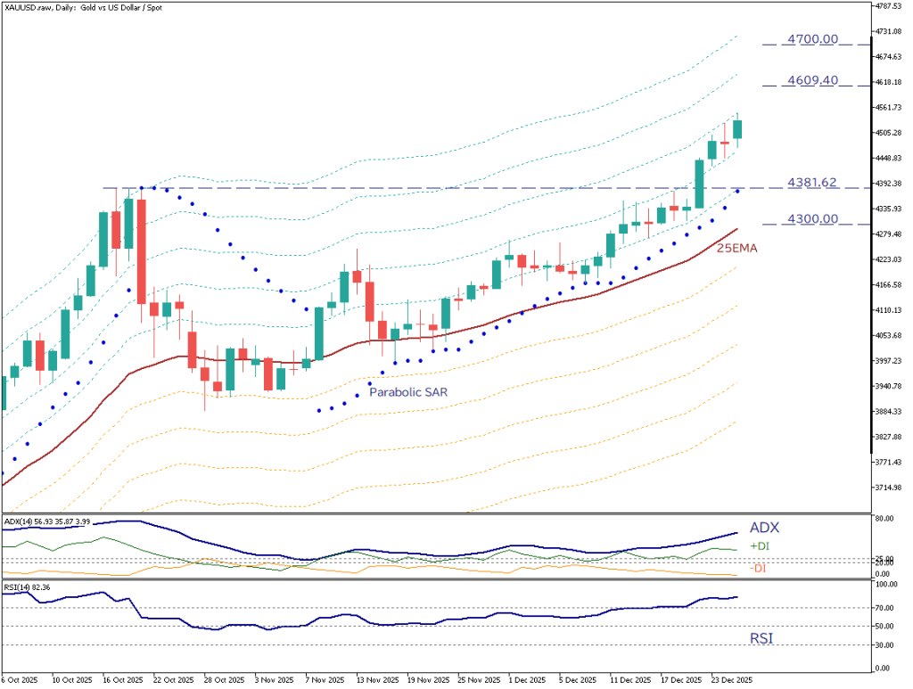 ゴールドの日足チャートを分析する。価格は、2025年10月20日に付けた過去最高値4381.62ドルを上抜け、さらに上昇トレンドが継続している。