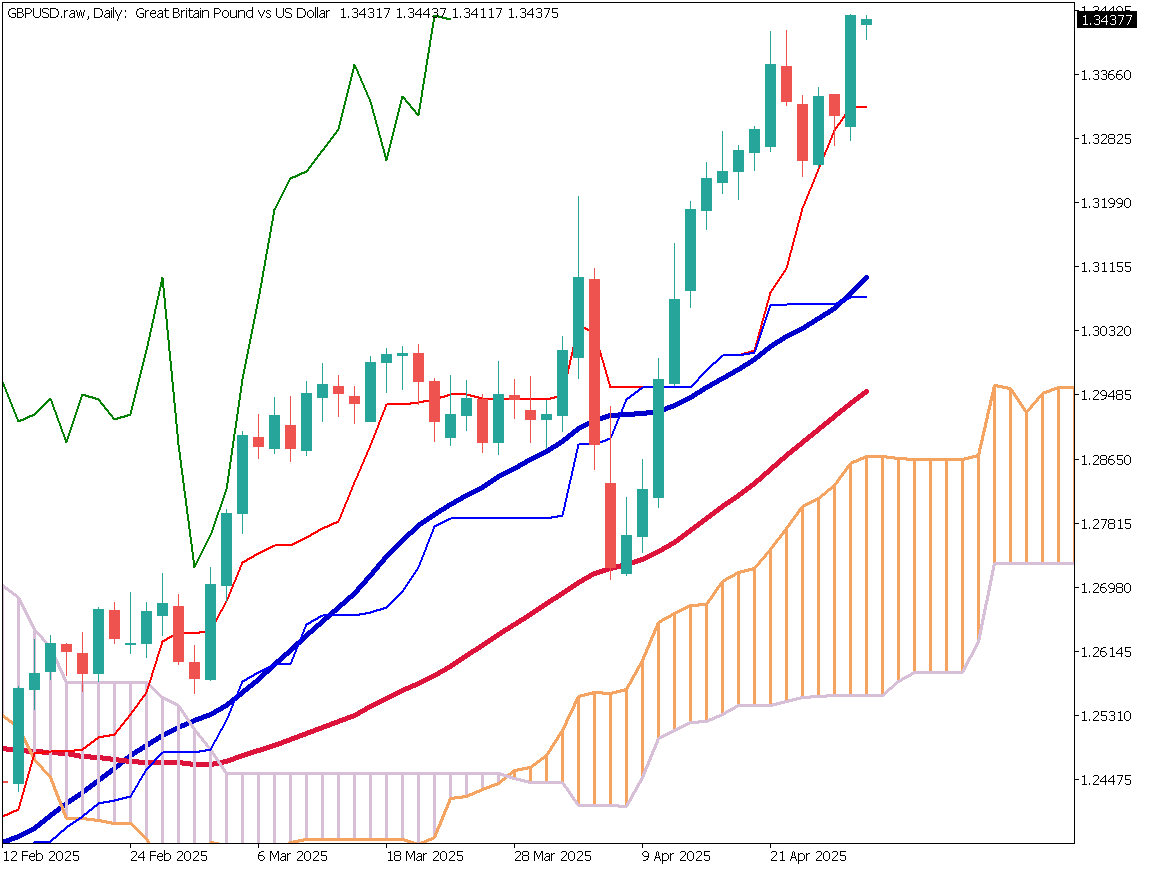 ポンドドルの日足チャートを分析する。ポンドドルは転換線付近で反発し、直近高値を更新。ダウ理論による上昇トレンドが継続することとなった。貿易交渉が進展する期待感があるポンドドルが買われやすくなったと考えられる。